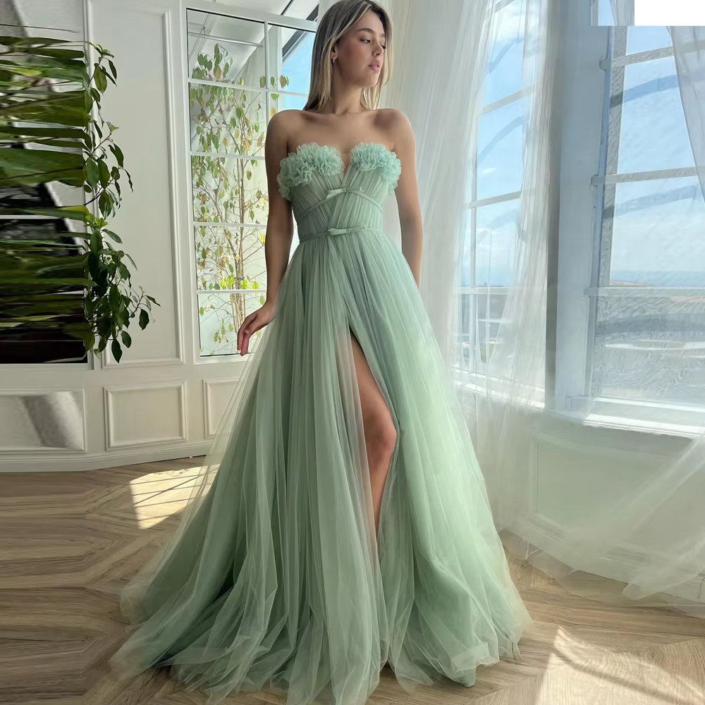 Unique Mesh Flowers Long Prom Dresses Sexy High Slit Tulle Puffy Women Summer Party Dress Elegant Mesh Puffy Brithday Gowns