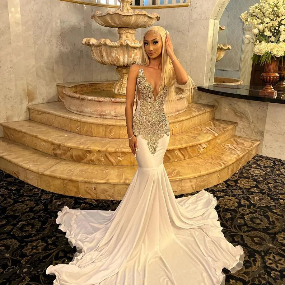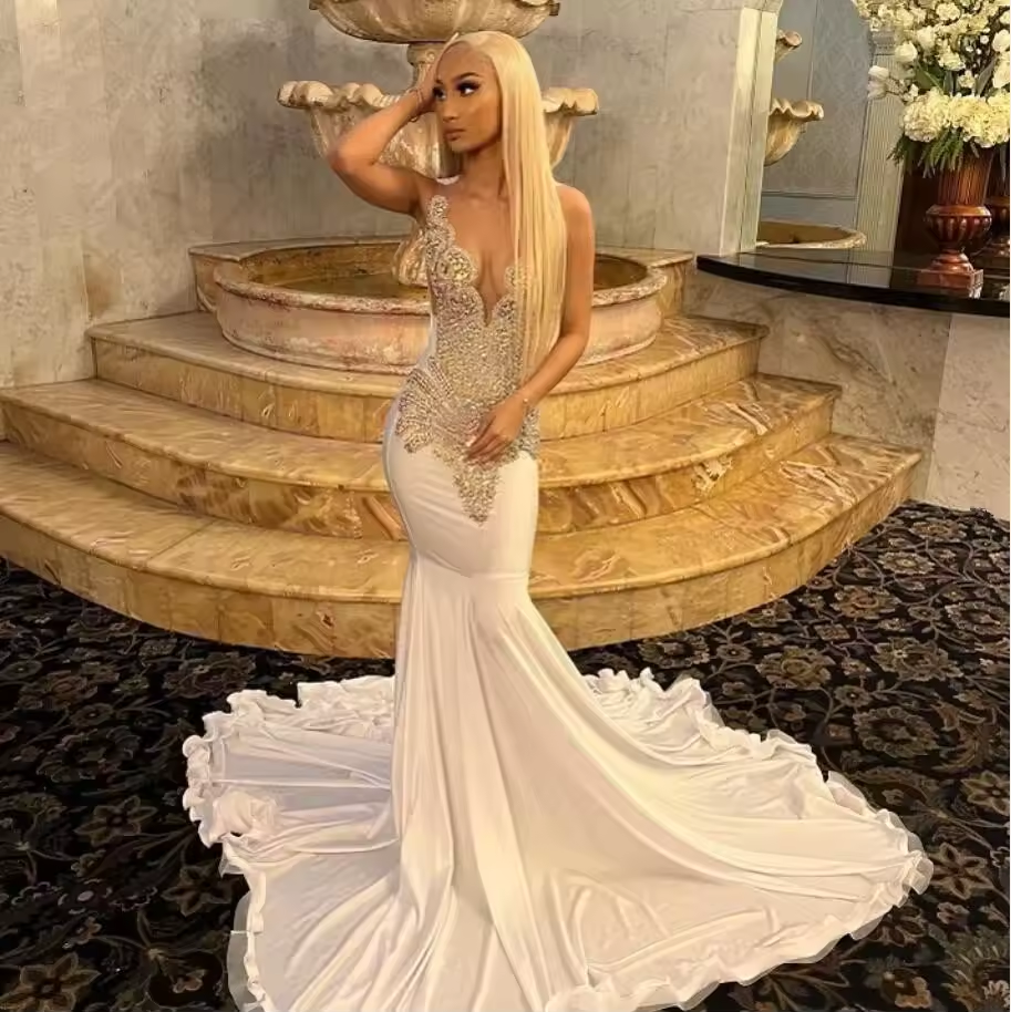 White Sparkly Mermaid Evening Pageant Dresses for Women Luxury Crystal Beaded Black Girl Prom Birthday Ceremony Gown