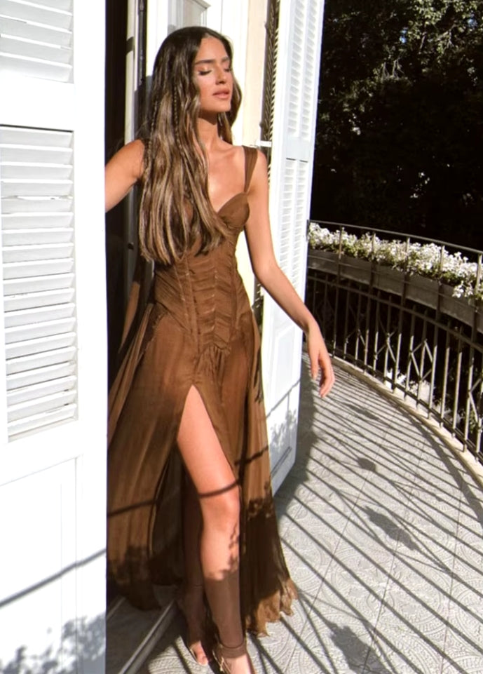 Women Long Dress Prom Party Dresses Coffee Silk Chiffon Sweetheart A Line Evening Gowns Side Pleats Formal Occasion Dress