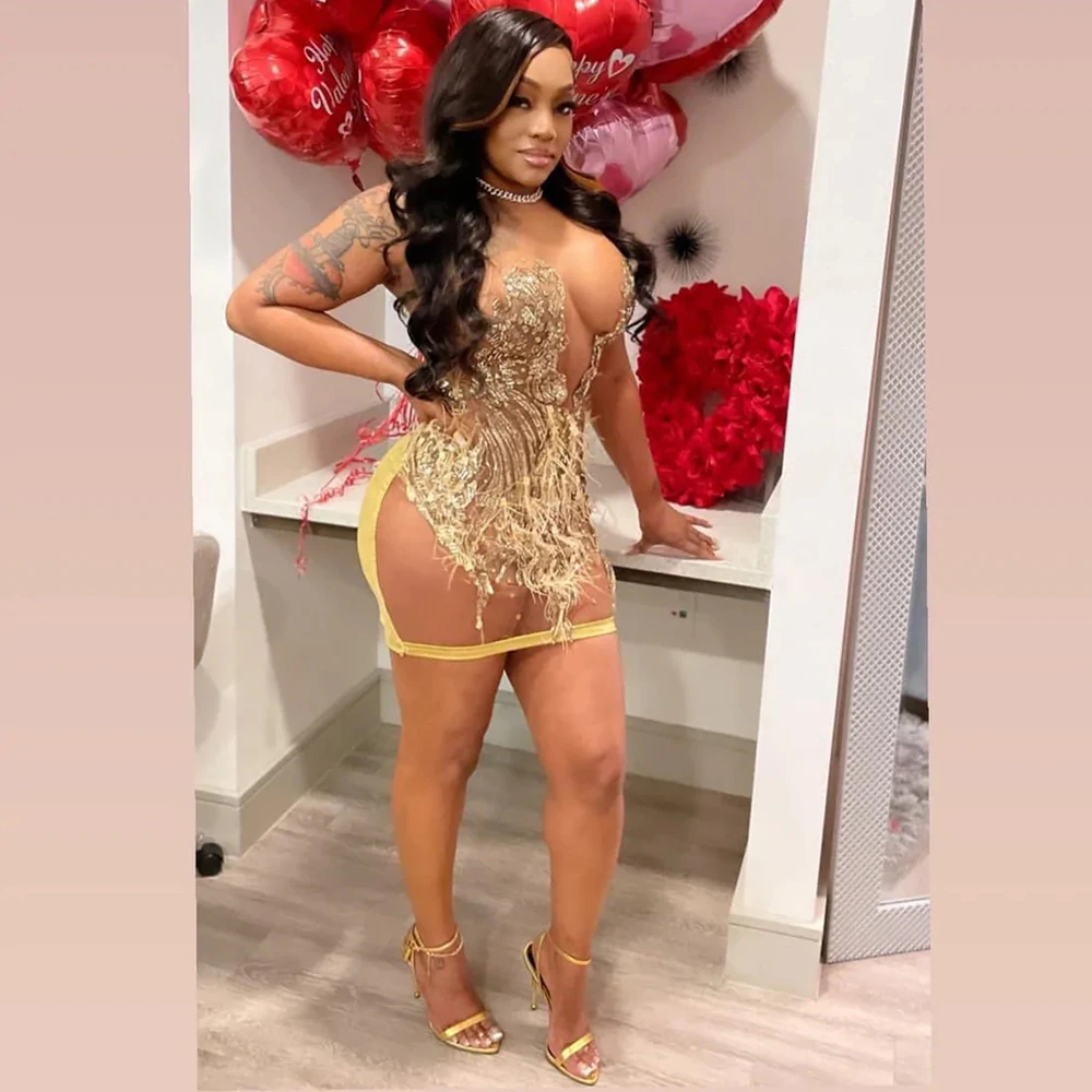 Women Sheer Gold Short Prom Dresses Sparkly Sequin Feathers Black Girls Mini Cocktail Gowns for Birthday Party Custom Made