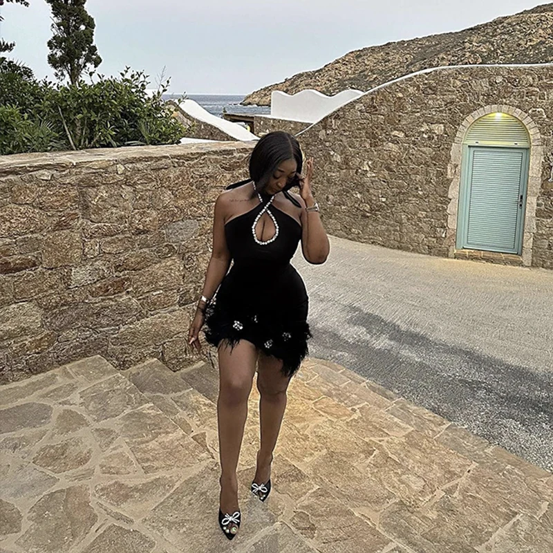 Women's Black Purple Spaghetti Strap Father Rhinestones Backless Sexy Celebrity Cocktail Party Bandage Dress